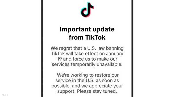 أبلغت شركة “تيك توك” المستخدمين في الولايات المتحدة في وقت متأخر من السبت، أن تطبيقها “لن يكون متاحا مؤقتا” اعتبارا من الأحد، عندما يبدأ سريان القانون الذي يحظر التطبيق في البلاد.