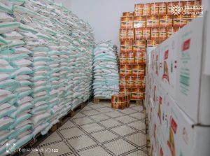 وتتكون السلة الغذائية الموزعة من: السكر، التمر، الحليب المجفف، الزيت و الشاي.